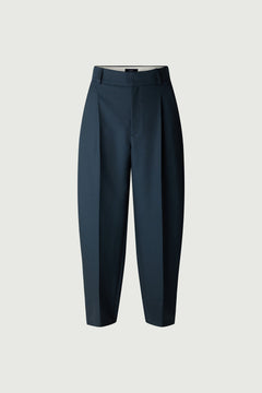 EVA is an asymmetrical blouse in petrol wool fabric, with a loose cut and open neckline. Two-panel hem and hemmed sleeves. Architectural cut and adjustable boat neck create a sophisticated look.