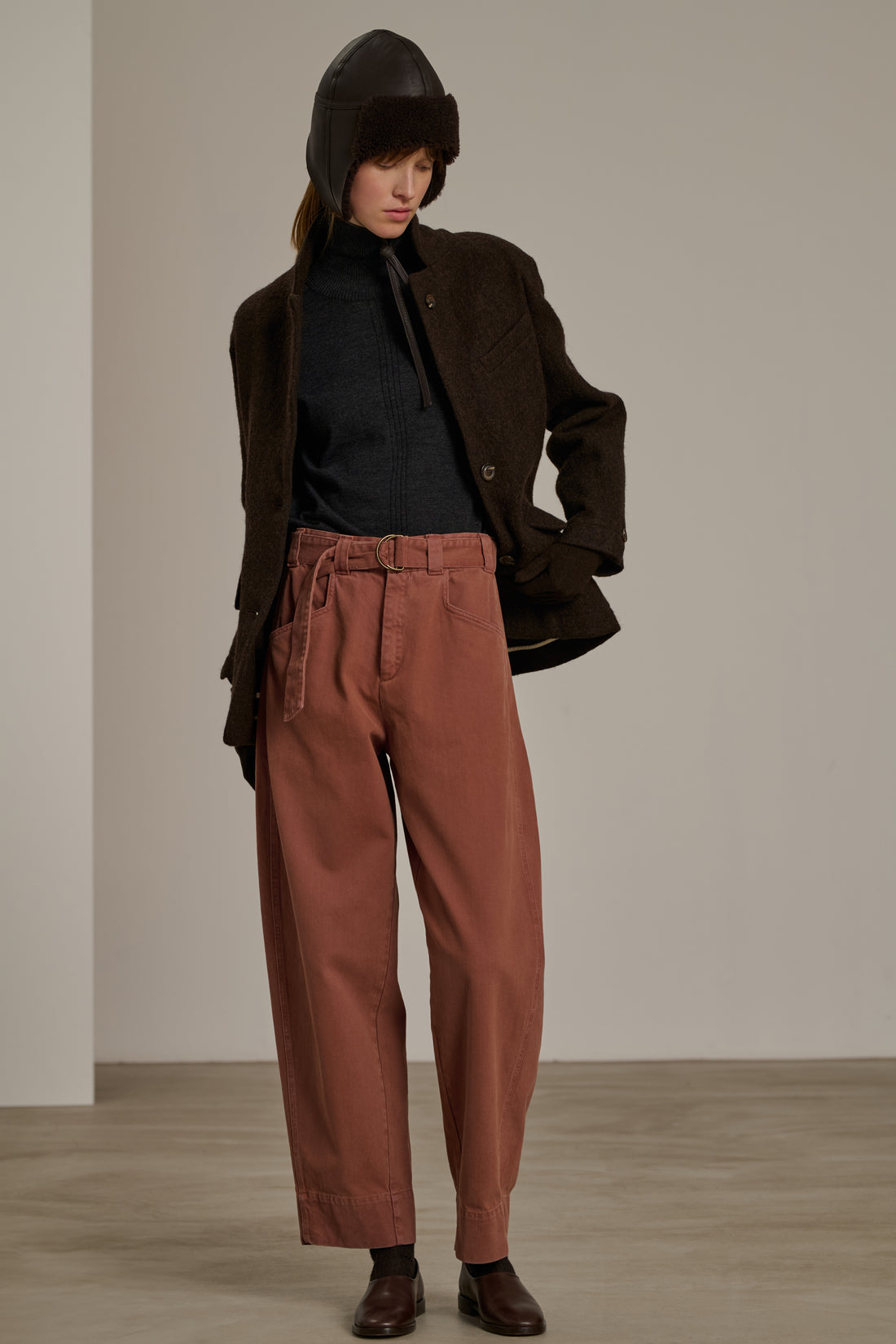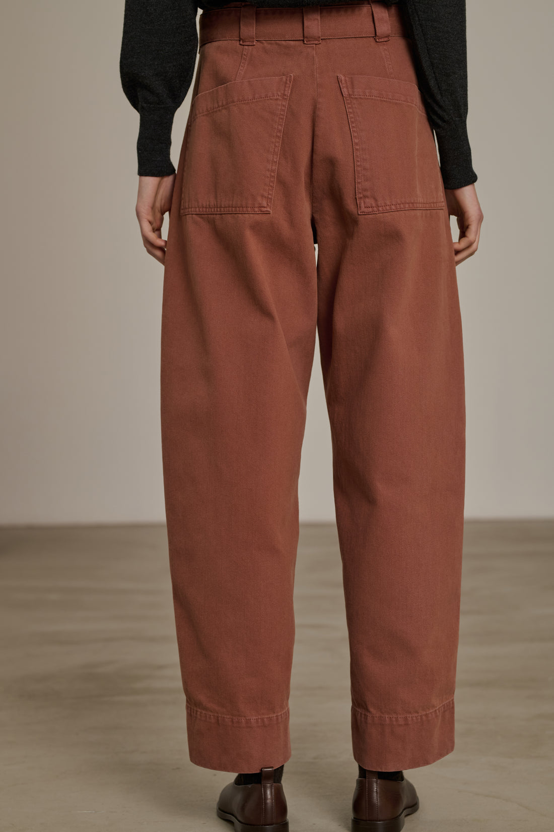 VOLAGE are high-waisted jeans adjustable with a wide slide belt. The thick cotton fabric emphasises its rounded volume. It's recognisable by its slanted-cut pockets. The legs are intentionally long to offer varied lengths and can be worn rolled up.